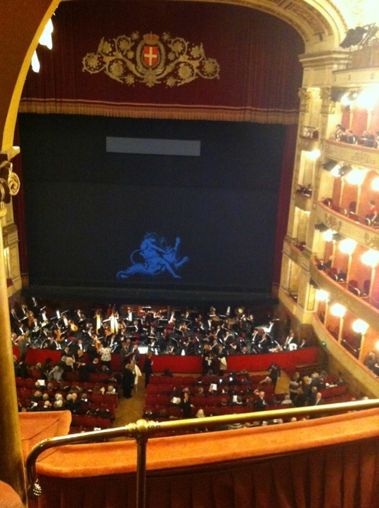 最後は天井桟敷というガッレリア(Galleria)で、会場を取り囲む壁の上のほうにあります。一番良い席のプラテアと違って舞台まで距離があるので、登場人物が親指の先位の大きさで見えますが、音はばっちり聞こえますので心配いりません。ここは1枚15ユーロ程で購入ができます。気軽な服装でもOKです。