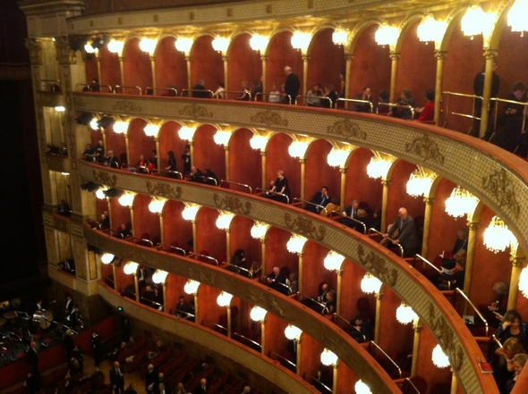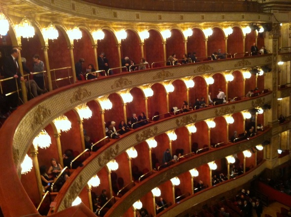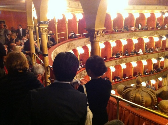 ↑ 今年の春にオペラのチケットをお友達にいただき、行って来た時の写真です。携帯からとったので少しぼやけ気味。上映30分前の写真です。開演時間は午後8時で上映時間は4時間でした。