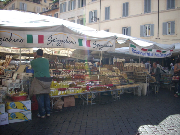 ↑ どこもかしこも石畳!ローマのカンポ・デ・フィオーリ広場の朝市にて。