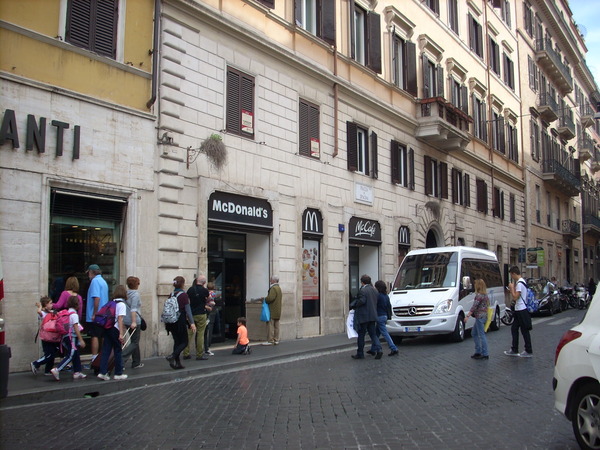 ↑スペイン広場にあるマクドナルド。階段を背にすると左の方向にあります。(ミンニャネッリ広場方面へ行って下さいね)イタリアには1986年にマクドナルド第一号店が出現しました。ファーストフードを好まず食にこだわるイタリア人なので、最初は本当に観光客しか入らなかったとか。このマクドナルドは入口を入ってすぐ右に甘いものが揃う朝食コーナー(チーズケーキ、マフィンなど)、2階には大きいトイレもあり利用価値ありです。