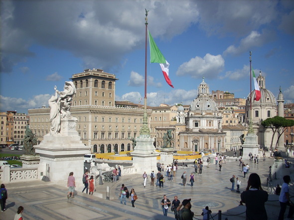 好天のローマから、真っ白なウエディングケーキ (入れ歯とも)いわれるヴィットリオ・エマヌエーレ2世記念堂からの美しい眺めをお届けします!巨大な記念堂はヴィットリオ・エマヌエーレ2世という王様を記念して建てられたものです。イタリア統一は1870年と結構最近の話で(翌1871年にはドイツも統一を達成しドイツ帝国に)、ヴィットリオ・エマヌエーレ2世はこのイタリア統一の立役者でもあった初代国王さんです。この記念堂(Monumento Nazionale a Vittorio Emanuele II) は200以上の公募作品の中から見事に1位を獲得した、サッコーニ氏のプランを元に約25年かかって1911年に完成しました。記念堂のある広場はヴェネツィア広場といって、各方向へ行く道が集中しているターミナル広場でバス停がたくさんあります。