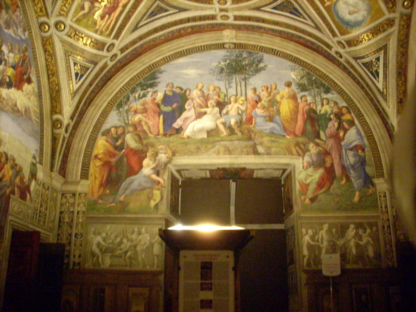 ↑ラファエロの間の一つ、署名の間のパルナッソスの絵。1508~1511年頃のもの。(夜間撮影したのでぼけてしまいました)