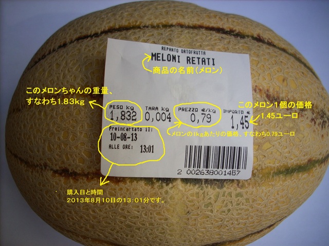 1個2kg近いメロンは、大人の女性の方でも食べきるまで数日かかります。1ユーロ128円で計算しても安いです。食べきれなかったメロンちゃんはお部屋の冷蔵庫に。