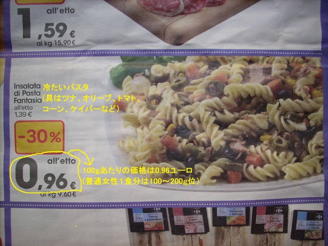 お惣菜コーナーでパスタを買うとものすごく出費が抑えられます!このパスタは100g(1人分)で日本円に換算すると123円程です。夏はお米のサラダもあります。お惣菜コーナーにはイワシの酢漬けなど色々あります。