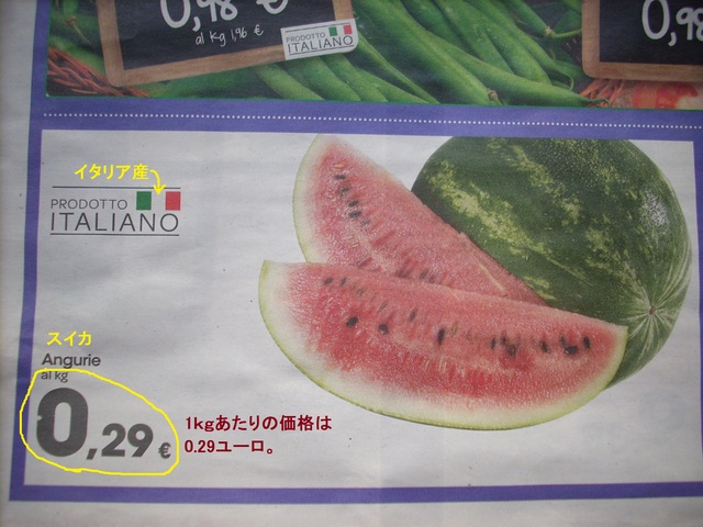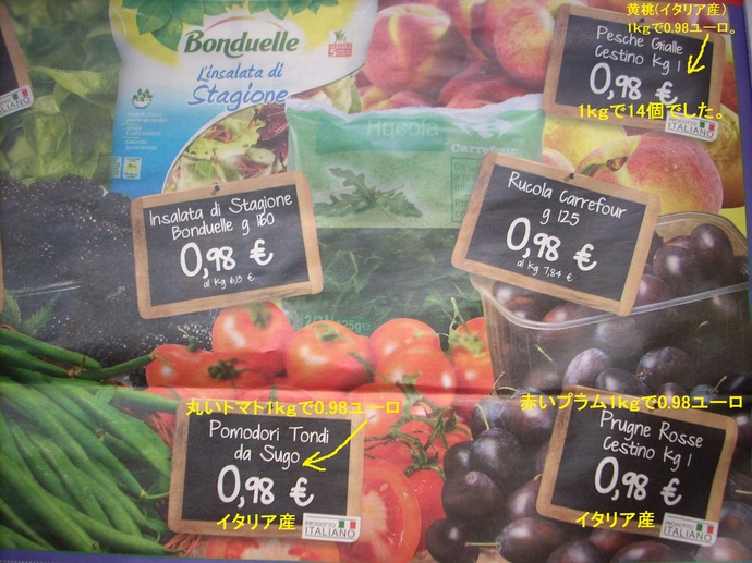 日本に比べるととても安価な商品といえば何といっても野菜、フルーツです。特に旬の果物は驚く程安く、どんぶり一杯食べても130円位だと思います。果物ナイフがあれば、色々な種類のフルーツを刻んでヨーグルトの中に入れると、お腹も膨れて良いと思います。果物は体にいいですし、イタリアではバラ売りですので、お好きなフルーツ1個からでも購入できます。4~5種類毎日日替わりで楽しんでみて下さい。