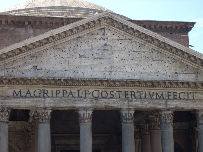 そのかわりに、初代パンテオンを建造したアグリッパに敬意を表し、ラテン語でM•AGRIPPA•L•F•COS•TERTIVM•FECIT (Marcus Agrippa, Lucii filius, consul tertium fecit)