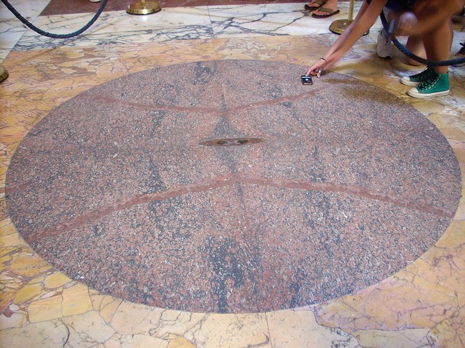 ↑ 天窓の真下です。携帯電話を床に置いて、まん丸の天窓の写真を撮っていく人が多くいます。