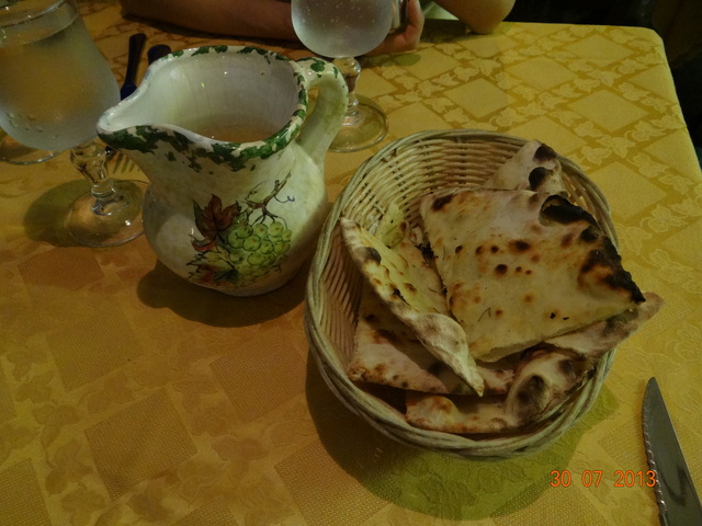 フォカッチャ(トマトソースなしのローズマリーと塩で味付けした白いピザ)は2.5ユーロでパンの代わりに食べたい時に。一番値段が安いのはトマトソースとオレガノのみのピザ、ピッツア マリナーラで4ユーロ。ピッツア マルゲリータ(トマトソースとモッツァレッラチーズだけのシンプルなピザ)でも4.75ユーロ。ピザは薪を使ってカマドで焼きあげ、薄くてパリパリでとてもおいしいと地元のイタリア人にも評判です。このお店では何よりピザを食べてみることをお奨めします。写真の水差しの中(500ml)はスパークリング白ワインです。魚料理なので一杯やるなら白です。(普通の白より口あたりが爽やかなスパークリング白ワインもメニューに載っていなくても大概あるので、聞いて見て下さい。)