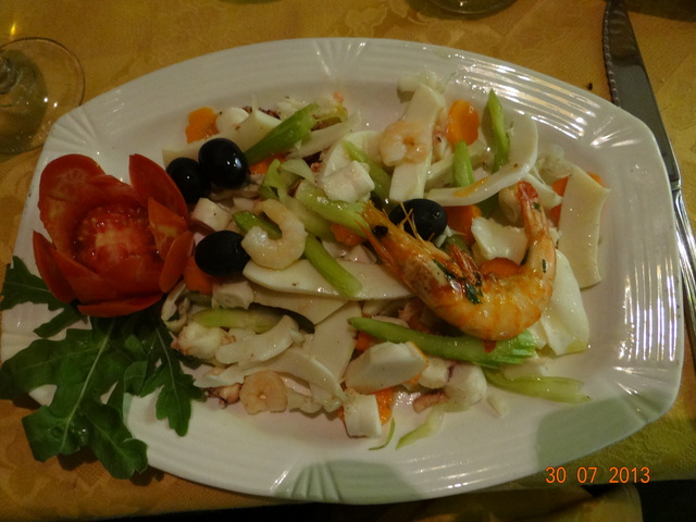 Insalata di mare (インサラータ ディ マーレ)とは海の幸のサラダ。10ユーロ。ゆでたイカや海老などの魚介類を人参やセロリなどと一緒にオリーブ油やレモン汁とあえたサラダで、夏場には良く好まれます。
