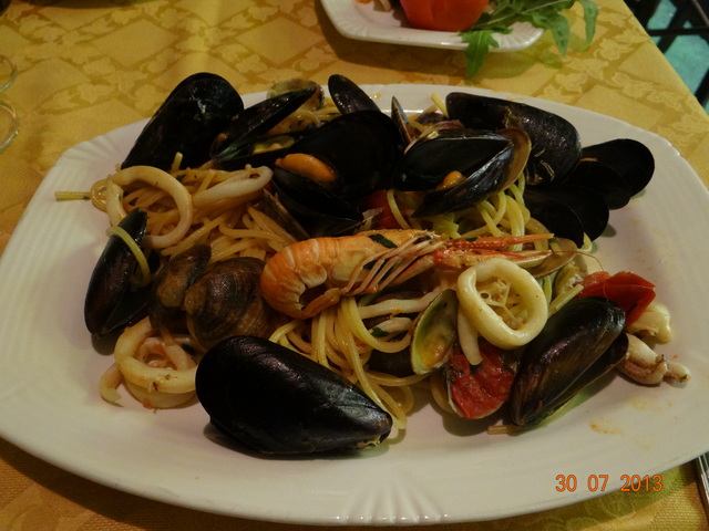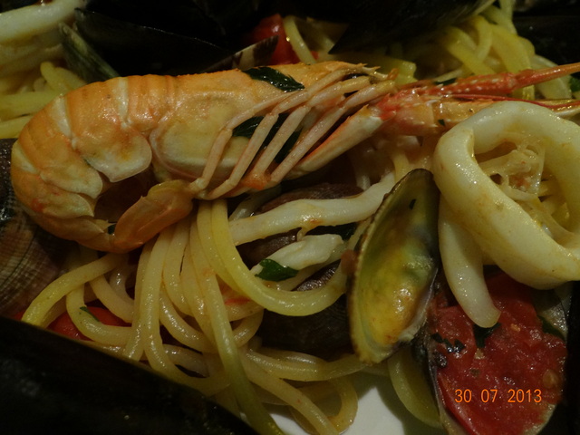 Spaghetti allo scoglio (スパゲッティ アッロ スコーリョ)は海の幸のスパゲッティといえます。1人分を頼んだのですが、量が多く、この筆者でも四分の一位残しました。よく見ると2人で1つ注文して食べている人もいました。10.5ユーロです。ピザと魚介類がおいしい店なのでヴォンゴレスパゲッティ(あさりのスパゲッティ)もお奨めされました。