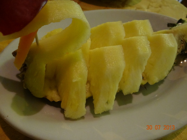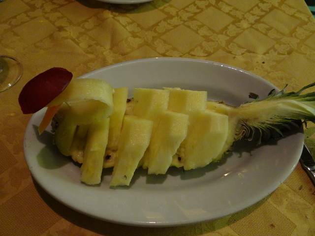 同席のイタリア人の友人はダイエット中なので、酵素たっぷりのパイナップルを頼みました。ダイエットをしていなかった先月まではいつも食後にジェラートを3玉頼んでいました。パイナップルもイタリアでは食事の後のデザートとして良く好まれます。3.5ユーロ。