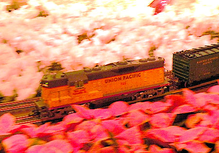 このシクラメンのベッドは線路でぐるりと囲まれていて、そこではオモチャの機関車が走っています。