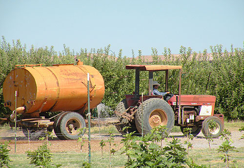 よく見ると、トラクターで引っ張るタンクから水が撒かれていました。