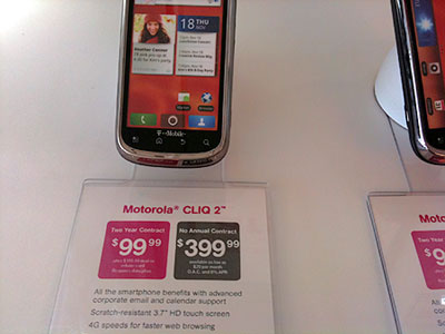 たとえばこちら、モトローラのCLIQ 2という機種で、つけられている値段が$399.99なのに対し、