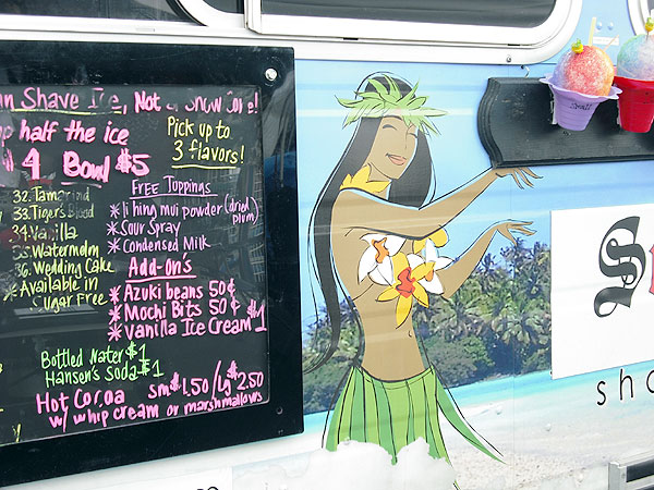 オーナーのマリアンは、ご主人がハワイアンだそうで、ハワイ名物のシェイブアイスをちゃちゃっと作ってくれます。シロップの種類がたくさんあって、結構迷います。
