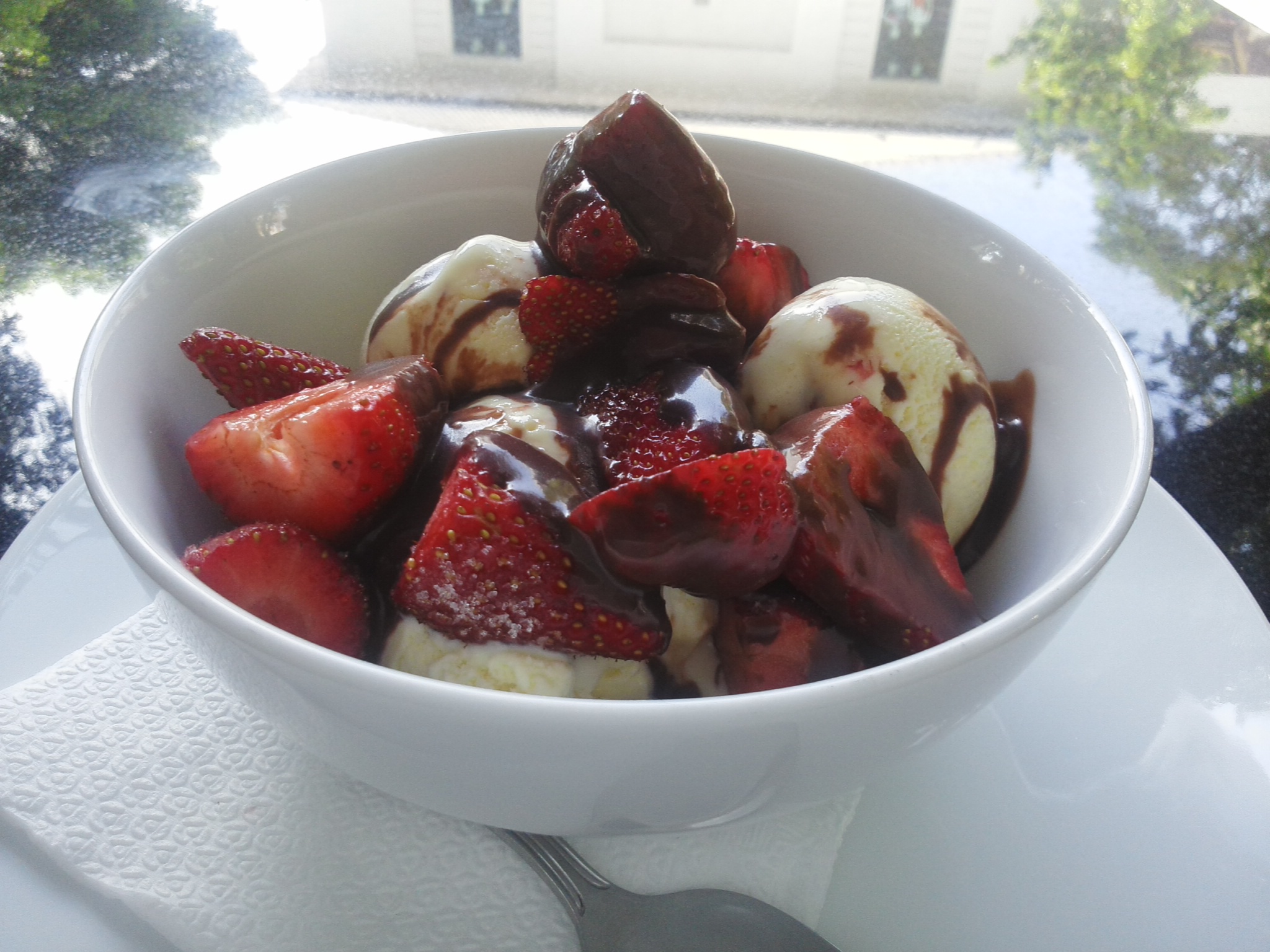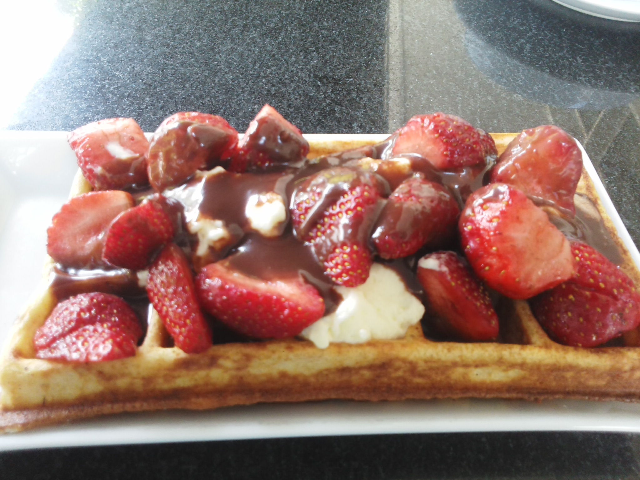 オーダーしたのは、ワッフルにイチゴにクリームとチョコソースがかかったもの
