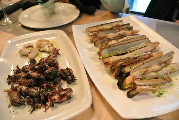市場で買ったのは、マテ貝、あん肝、縞鯛、セピオネッと呼ばれる小さなイカ、イカの卵に