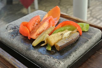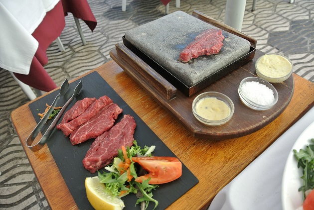 こんな風にテーブルの脇にアツアツの石がセットされ、その上でお肉を焼いて頂きます。