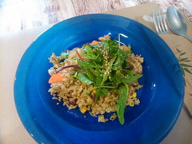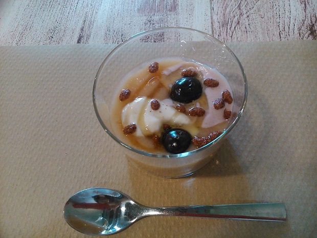 長い玄米料理+桃と豆乳ヨーグルトのデザート。予想以上においしく、ご飯はお代わりしたかったくらい。