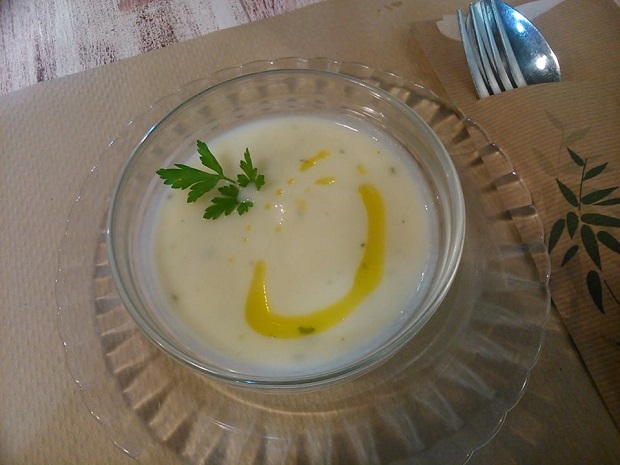 10ユーロのランチメニューがあり、この日はぬるめのカリフラワーのクリームポタージュ+野菜入りの