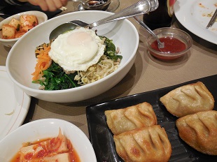 平日のお昼にはランチメニューがあります。最初に韓国風蒸し餃子か鶏のスープを選べ、それにビビンバ、