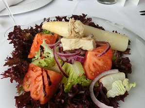この写真は、その前に行った時にアラカルトで頼んだサラダとバレンシア風パエージャ。