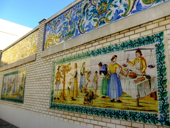 この市場に向かって右側には公園があり、そこには昔ながらの子供の遊びがタイル画になっています。