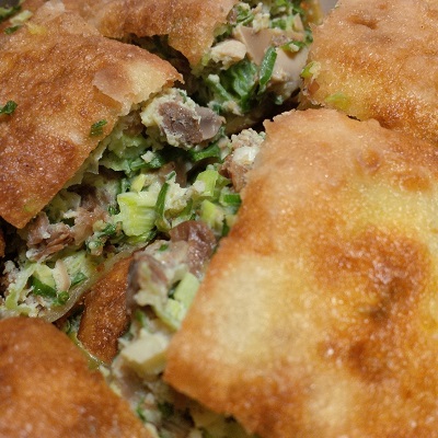 薄く延ばしたピザ生地みたいなものに乗せて油で揚げます。