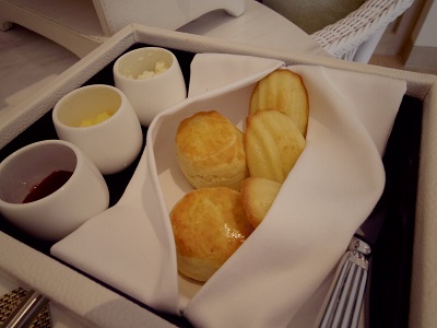 一番下から、スコーンとマドレーヌ。