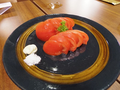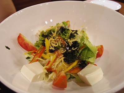 まずは野菜から、冷やしトマト、ぱりぱりのラーメンサラダ、豆腐とじゃこ。