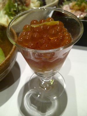 前菜はサラダ、枝豆、イクラ+大根おろし、白子の4種。