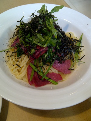 同僚はビーフベーコン+ホウレンソウ+ルッコラの和風パスタ