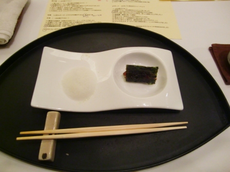 海苔の中身はマグロ、左の白い泡のようなものはわさび。