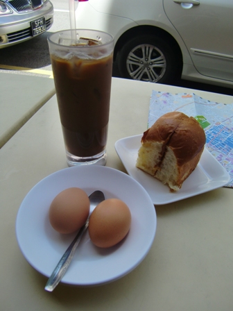 人気のカヤトースト+卵+アイスコーヒーを注文。S$8.00(600円ぐらい)だったかな。