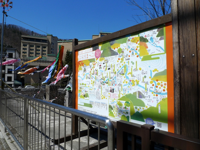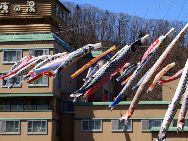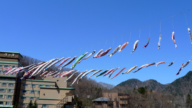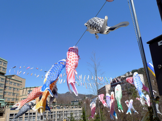 現在は豊平川上空のみならず、定山渓温泉のあちこちに大小さまざまの鯉のぼりが見られます。