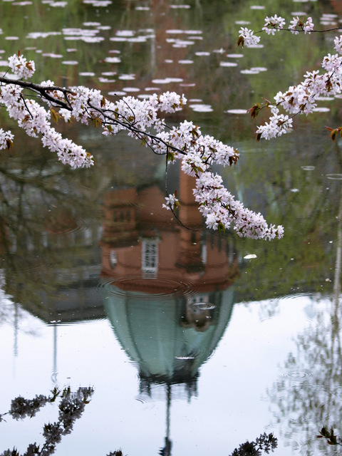 池に映った赤レンガ庁舎とエゾヤマザクラ。