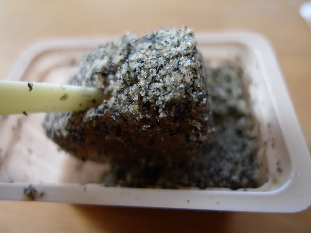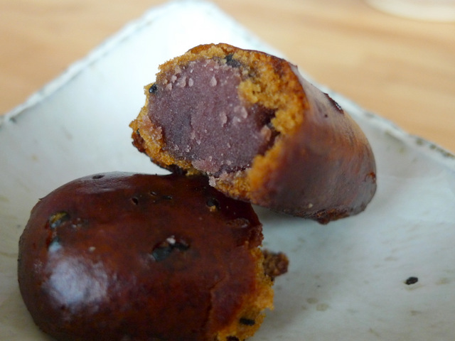 十勝産あずきの餡と黒みつ・黒ごまたっぷりの黒みつかりん、1個76円(税込83円)。