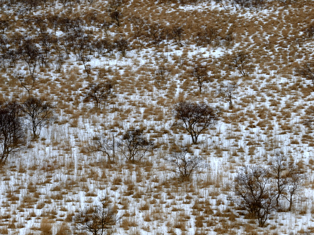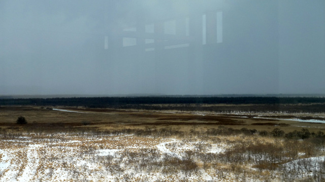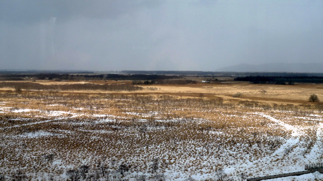 さっきまで雪が降っていたので、残っていた雪雲の影が湿原の上を動いていきます。