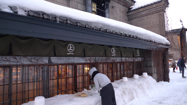 堺町通り。立ち並ぶどのお店の前にも夕暮れを待つたくさんのアイスキャンドル。