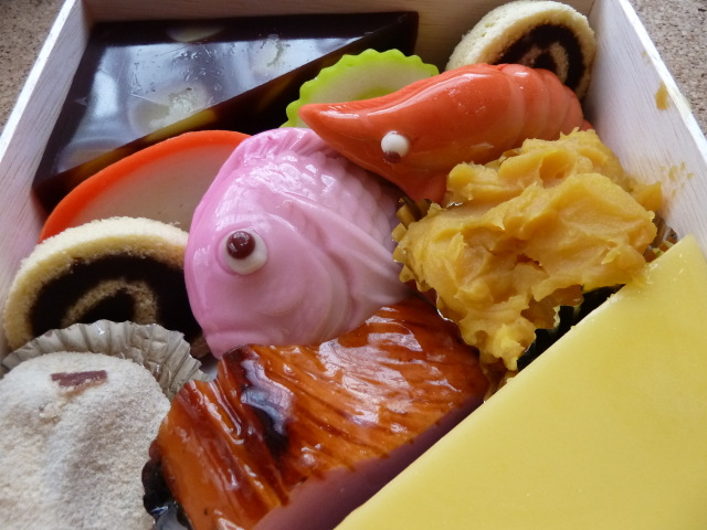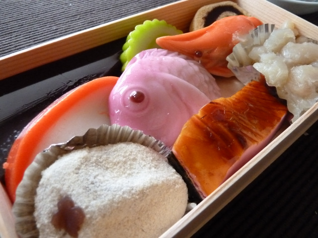 おせち料理のように縁起のよい鯛や海老が見えますが、すべて白餡を使った練り切りやすあま、羊羹などで、正式(?)には折箱入りです。