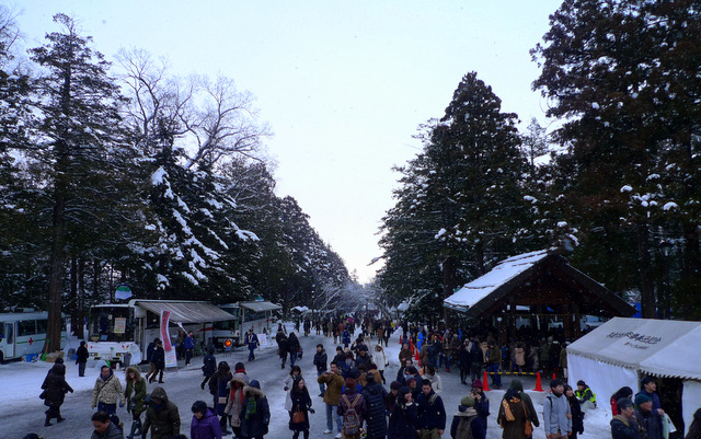 元旦に比べ参拝者はまばらですが、お正月三が日とあって表参道には人がひっきりなしに行き交っています。