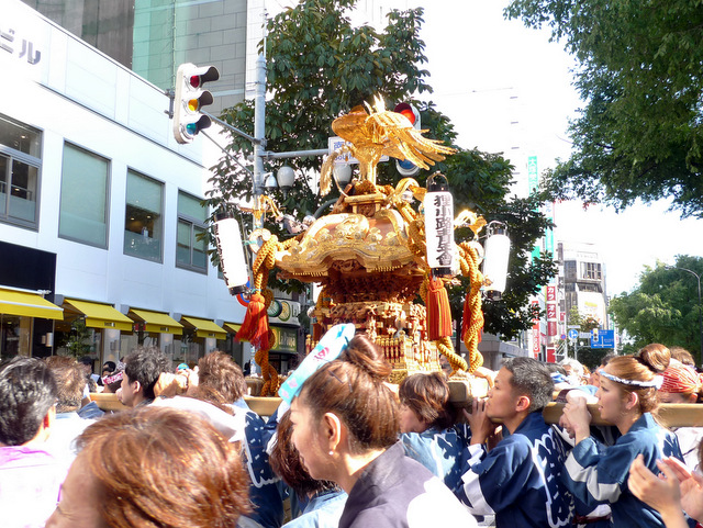 いなせなお兄さん、粋なお姉さんたちが威勢よく御輿を担いでいます。