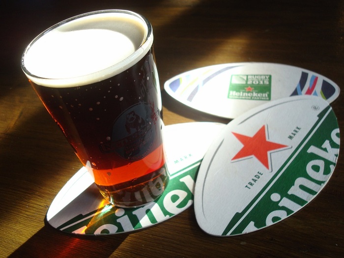 じゃあ私も、ラグビー気分でビールにしよう。「サフォーク・カントリー」という、まろやかなビターをハーフ・パイントで。コースターは「ハイネケン」のだけれど、ラグビー・ボール型なのが気分ですね♪