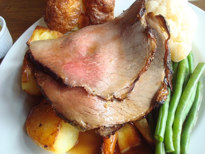 てっぺんに載ってたヨークシャー・プディングを脇によせると、ロースト・ビーフの大きな切り身が2枚。ちょうど良い焼き加減で、とてもジューシー。美味しいお肉でした!