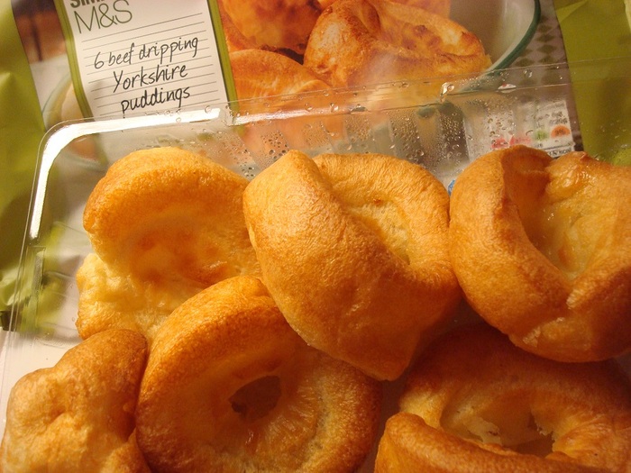 家庭でも本来ならば卵や牛乳などで自家製を焼くのが一番ですが、オーヴンで数分間焼くだけの既製品も簡便でポピュラー。それに生のじゃが芋から作ると焼き時間が非常に長いロースト・ポテトだって手軽な冷凍食品がありますし、グレイヴィーソースもお湯で溶くだけのインスタント商品が揃っています。