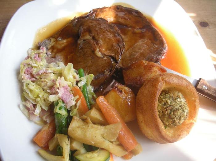 オーヴンでローストした塊肉(牛肉、鶏肉、豚肉、子羊肉など)を切り分けたものに、野菜やローストポテト、そしてヨークシャー・プディングを添えて・・・仕上げにグレイヴィーと呼ばれる、肉汁を基にしたソースをなみなみと!