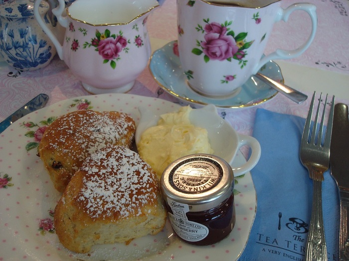 サンドウィッチやパスタなどの食事もありましたが、午後はアフタヌーン・ティーやクリーム・ティーも供されていました。そこでクリーム・ティー(スコーン&飲み物のセット)を頼んでみたところ、運ばれてきたのがコチラ。↓