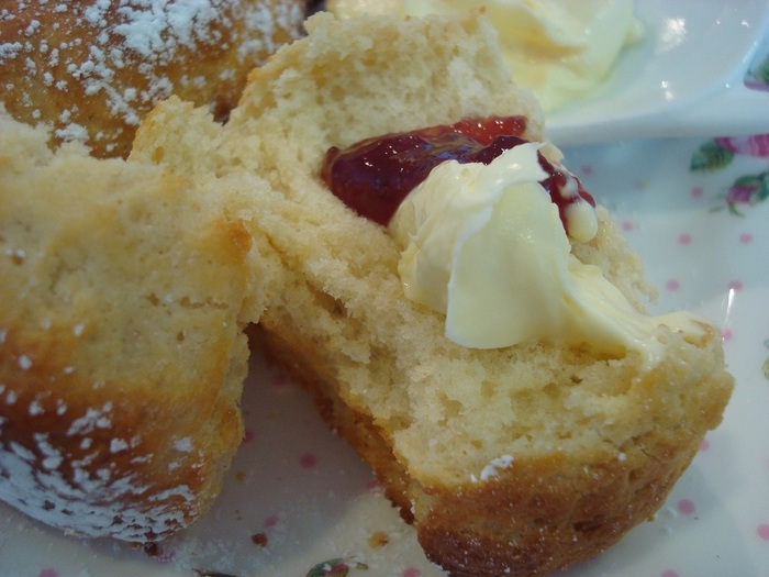 カリッと香ばしい外側の中はサクサク、ホロホロって優しくて・・・少なくとも、ここ1~2年間で食べた中で一番かも?と思うくらい絶品だったのです。クロッテッド・クリームと苺ジャムを添えて、いただきまーす♪