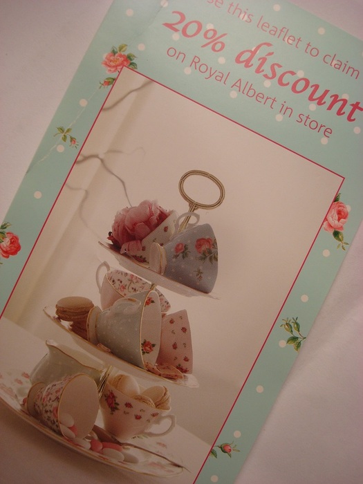 更にお会計の時にレジへ行ったら、ロイヤル・アルバート製品の割引券もありました。ここでお茶してカップやお皿が気に入ったら、ついでに食器売り場へも立ち寄って20%OFFでゲット!という、なかなか憎いアイディアです。