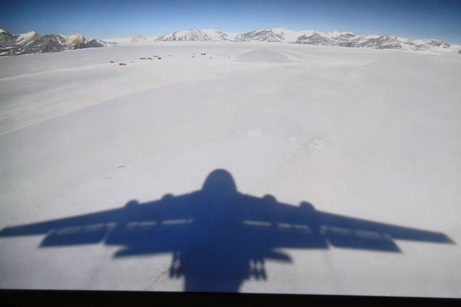 南極大陸行き飛行機は、離発着地に大きなモニターでその様子をご覧いただけます。自然の青氷の滑走路は大陸内だからこそのダイナミックさです。
